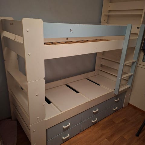 Osia voidaan käyttää yhdessä tai erikseen. Myydään kuitenkin kaikki yhdessä. Sänky ollut viimeisimmäksi käytössä parvisänkynä. Kerrossängyn alasänky on vedettävä ja pituutta voi säätää.
