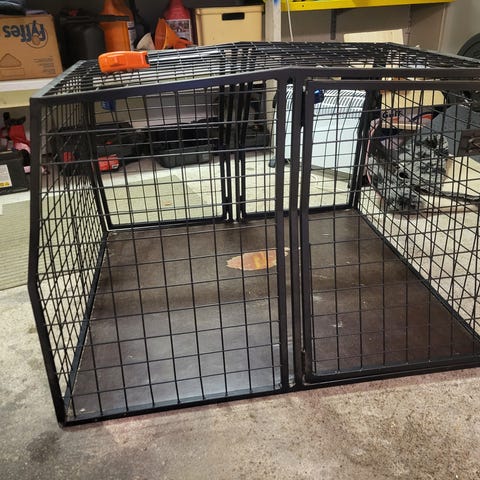 Myydään tilava autohäkki irrotettavalla väliseinällä.