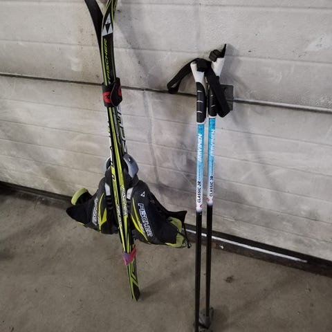 Sauvat uutena ostettu viime talvena, paristi hiihdetyt mutta lenkit hävinneet.. Sukset vanhemmat ja käytetyt, mutta vielä toimivat!