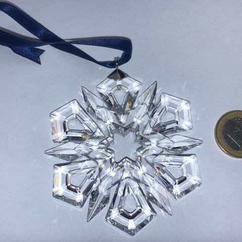 Swarovski 5557796 Annual Edition Ornament 2021 (2021-2021), viallinen yksilö: alimmassa pienessä sakara päässä pikkuinen särö, ja alkuperäinen nauha puuttuu. Mukaan saa vaaleansinisen ohuemman nauhan joka ajaa asiansa: koriste vähemmän vaativalle keräilijälle. Kolikko mittakaavana. Myynnissä useita muitakin Swarovskin vuosikoristeita, katso muut kohteeni.