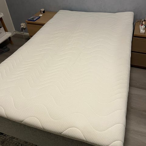 120cm tukeva puinen sängyn runko ja n. 12cm paksu siisti vaahtomuovipatja. Rungon saa purettua osiin.