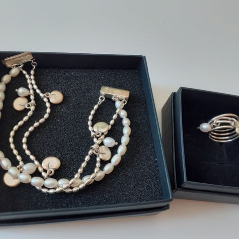 Kalevala Vanamo sormus ja rannekoru, helmenvaalealla kivellä, sormuksen koko 17.0 ja rannekorun 17.5 cm.
