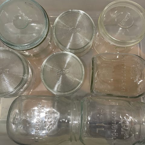 Lasisia keittiötölkkejä ja pulloja: Karhulan Lasi, Riihimäen Lasi, Töölön Panimo
