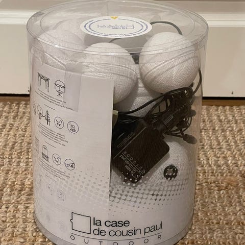 Koristevalosarja, La Case du Cousin Paul, jossa on useita palloja eri väreissä kuten valkoinen, vaaleanpunainen, harmaa ja oranssi. 35 osainen pidempi valosarja on tarkoitettu sisäkäyttöön ja soveltuu koristeeksi erilaisiin tiloihin. Esim lastenhuoneeseen. Nouto Espoon Laaksolahdesta. Kytkin päälle ja pois