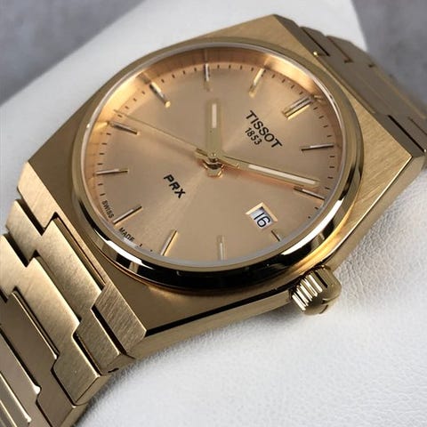 Tissot PRX, hopean varinen upeasti suunniteltu kello! Kvartsi koneistolla oleva vuoden 2021 PRX hehkuu nostalgiaa. Safiirinen lasi suojaa upeaa