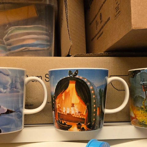 Arabia Muumi mukit, neljä erilaista kuviota. Materiaali posliinia, eri värejä ja kuvituksia. Sopii päivittäiseen käyttöön tai keräilyyn.