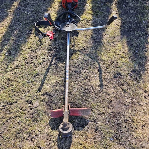 moottorikäyttöinen raivaussaha, varustettu kahvoilla ja polttoainesäiliöllä. Sopii ruohon ja pensaiden leikkaamiseen. Laite toimii bensiinikäyttöisesti.