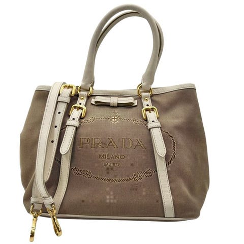 PRADA käsilaukku, beige kanvaasi, ruskea nahka, hopea, Japanista.