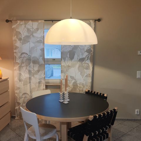 Musta, kiiltäväpintainen riippuvalaisin on Kristiina Lassuksen suunnittelema. Sen varjostimessa on geometrinen, fasetoitu muoto, joka luo tilaan modernin ja veistoksellisen ilmeen.”Minua on aina kiehtonut epäsymmetrisyys ja tasapaino, rauhallisuus ja monikäyttöisyys. Mietin tuotesuunnittelussani aina paljon myös ympäristöä ja tunnelmaa sekä yhdisteltävyyttä erilaisiin tuotteisiin.” – Kristiina LassusLasKos on tullut valituksi useampaan kansainväliseen sisustusprojektiin sekä julkiseen rakennuskohteeseen.The Chicago Athenaeum Museum of Architecture and Design antoi LasKos-valasisimelle arvostetun GOOD DESIGN-palkinnon vuonna 2014.Varustettu valkoisella tekstiilijohdolla ja maadoitettulla kattopistokkeella.Valmistaja: FOSTOMalli: LasKosKanta: E27, Max. 40 WMitat (HxK) ovat noin 33 x 35 cmMaadoittettu kangasjohto kaksinapaisella valaisinpistotulpallaVäri: musta, valkoinenMateriaali: muovi/akryyli, tekstiiliKierrätyskeskuksen tarkistama tuote.