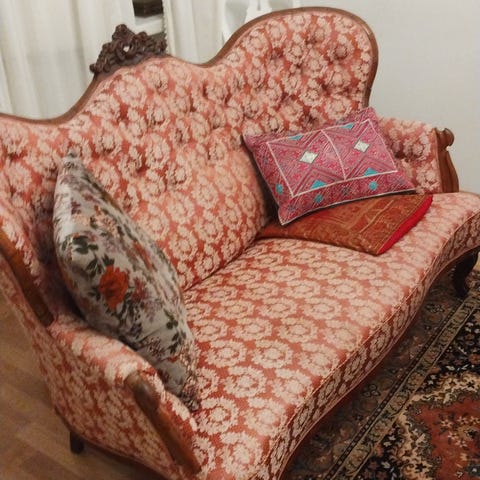 Hakusanat: vintage, sisustus, verhoilu, biedermeier, kukkakuvio, mukavuus, 1800-luku, eurooppalainen, naarmut, vintage huonekalut, käytännöllisyys, eleganssi, kuluma, puu, sohva, antiikki
