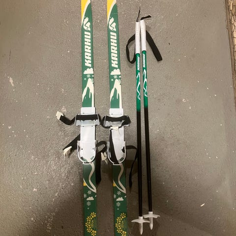 Peltosen kenkiin kiinnitettävät lasten sukset (pituus 110 cm) ja sauvat (pituus noin 75 cm). Muuten hyvässä kunnossa, mutta toinen side on vähän haljennut (kts. kuva), mutta se ei haittaa käyttöä.