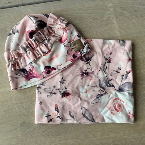 Ommellen clothing ompelemat frillapipo ja tuubihuivi noin 46/48 cm päähän. Meillä ei tyttö näitä kelpuuttanut.