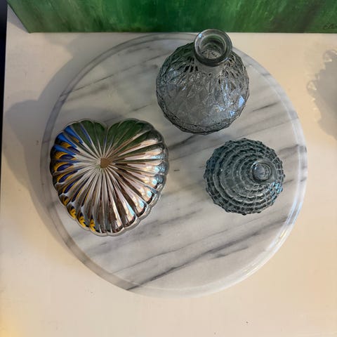 Kaunis vaikka hajuvesille, juustojen tarjoiluun, maustepurkkien alustaksi tai mihin vain keksii käyttää 😊.