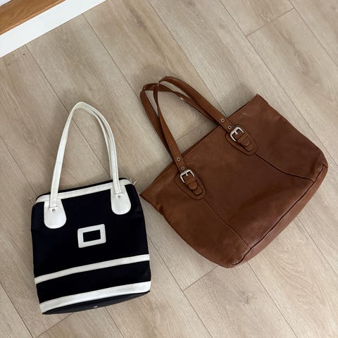 Musta Lumi laukku, violetti vuori, 2 sisätaskua, vetoketjukiinnitys. Leveys n. 42 cm, kokonaiskorkeus sankoineen noin 46 cm. Toiselta puolen alaosastaan on rispaantunut.