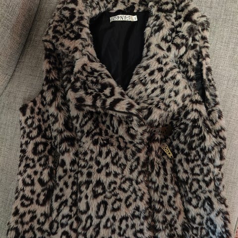 Leopardikuosinen tekoturkisliivi. Kokomerkintä puuttuu, mutta sopii ainakin S-kokoiselle. Leveys kainalosta kainaloon noin 50 cm. Pituus niskasta helmaan noin 78 cm.