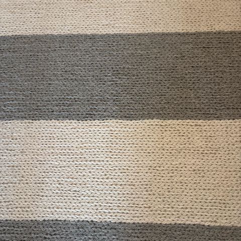 Vaaleanharmaa/luonnonvalkoinen villamatto, jossa loimi juuttia. Mattoa voi pitää molemmin puolin. Mattoa ei ole pesty mutta on siisti ja hyvässä kunnossa.