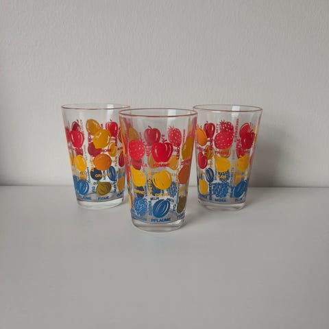 Vintage juomalasit 2 kpl mansikkakuvioinnilla. Lasin halkaisija on 6,5 cm, korkeus 12 cm. Lasit ovat siistissä kunnossa, vain pieniä käytön jälkiä.