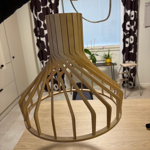Bambusta tehty riippuvalaisin. Kaupanpäälle hehku ja kattopistoke. Johdon pituus kannasta koukkuun 125cm.