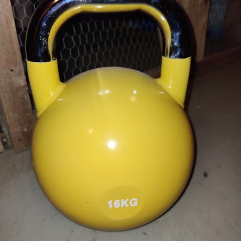16 kg. Wrange, competition kettlebell. Green. Light use. A quality kettlebell lasts forever. Gym mat included.