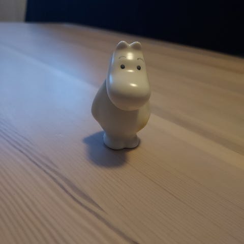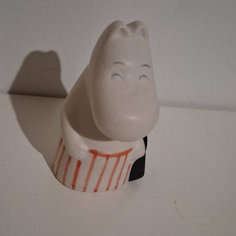 Muumit Muumimamma posliini figuuri, jossa on valkoinen pohjaväri ja punaiset raidat esiliinassa. Figuuri on muotoiltu Muumimamman hahmoksi, joka kantaa mustaa laukkua. Sopii koriste-esineeksi tai keräilyyn.