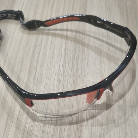 Seuraavalle käyttäjälle vielä menevät suojalasit salibandyyn. Muuten oikein hyväkuntoiset lasit, mutta oikean linssin alareunassa nirhauma, ks. kuva. Se ei kuulemma kuitenkaan ole haitannut sillä ei osu näkökenttään käytettäessä.