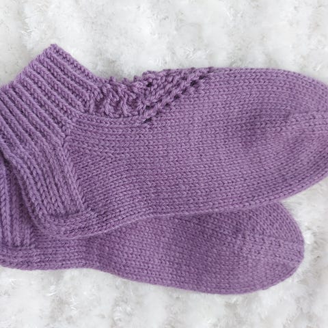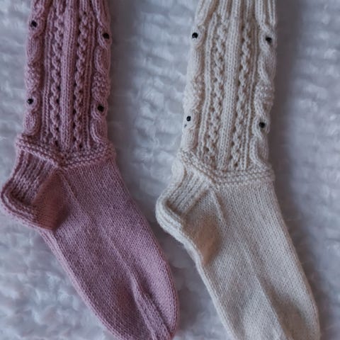 Sukkien etuosassa pitsikuvio, muuten suoraa neuletta.
