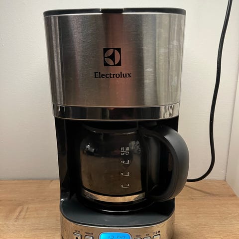 Electrolux kahvinkeitin, jossa ruostumattomasta teräksestä valmistettu runko ja lasinen kannu. Laitteessa digitaalinen näyttö ja ohjelmoitavat toiminnot, mukaan lukien ajastin ja automaattinen sammutus. Kohtalaisessa kunnossa; kansi ei taivu taakse vaan on irtonainen, pinttymiä sekä sisällä että ulkona (kts kuvat). Puhdistettu.