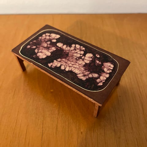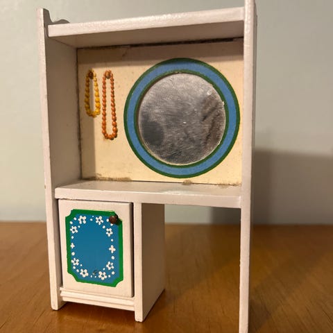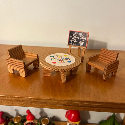 Lundby nukkekoti parisänky, yöpöytä ja verhot. Harvinaisempi kuosi. Hyväkuntoiset, verhojen kannakkeet ehjät.