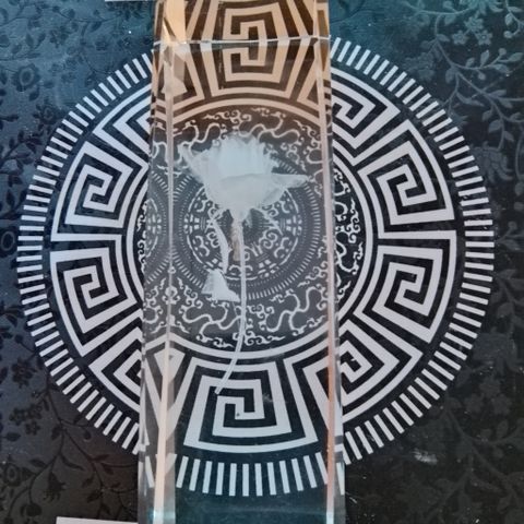 Lasinen ruusukoriste, punainen, vihreä varsi, paino 190g, pituus kukan päästä varren päähän 32 cm. Kukan takana vähän himmeällä tarra, jossa kirjainlogo JL ja tekstit Hand made ja Finland, JL Lasin taide-esine!