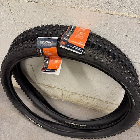Suomessa valmistetut talvirenkaat. Koko 29x2.25 (57-622). Renkaissa on 396 nastaa(Toisesta puuttuu 3, toisesta ei yhtään).