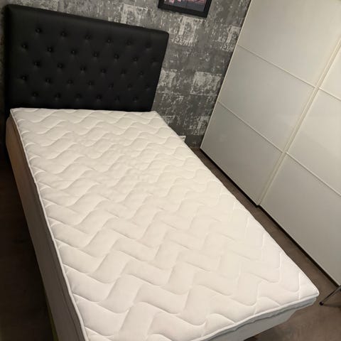 120cm leveä runkopatjasänky ja sijauspatja. Bonnell-jousitettu. Mukana jalat.