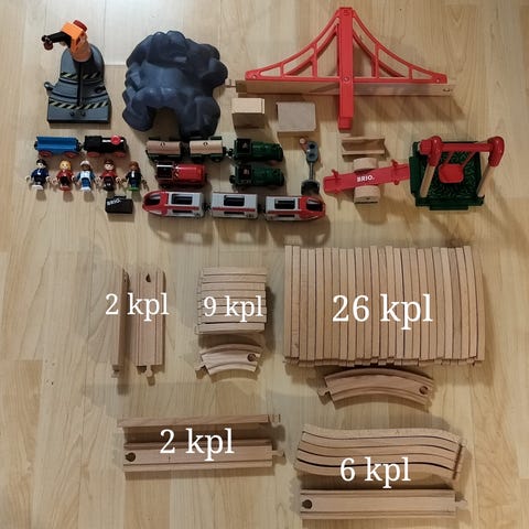 Kuvassa koottuna näkyvä setti junaradan osia, junia, rakennuksia, siltoja, kallioita, tallissa nyökkäilevät eläimet ym. Kaikki osat Brio-merkkisiä.
