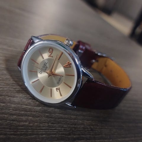 Diesel rannekello, jossa on kultainen metalliranneke. Patteri loppunut