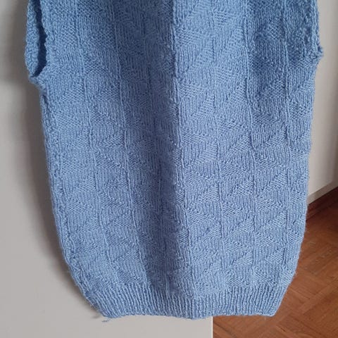 Neuleliivi, käsintehty. Olka- helma n. 49cm. Etukappa kainalo-kainalo n. 33cm.