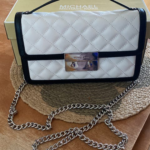 Myydään Michael Korsin hyvin vähälle käytölle jäänyt pieni musta iltalaukku. Laukku on erittäin hyvässä kunnossa eikä sisällä käytön jälkiä. Laukun ulkomitat ovat syvyys pohjasta noin 6 cm, korkeus ilman kahvaa noin 14 cm ja leveys noin 20 cm. Laukku sulkeutuu magneettiläpällä ja sisällä on pääosan lisäksi kaksi pienempää taskua. Laukun takana on myös kätevä erillinen tasku, johon pääsee käsiksi muuta laukkua avaamatta. Laukkua kannetaan joko kädessä pienestä kantokahvasta tai irrotettavalla ja säädettävällä crossbody kantohihnalla. Kultaiset yksityiskohdat. Laukku on ostettu aikanaan Korsin omasta Helsingin liikkeestä eli on taatusti aito.