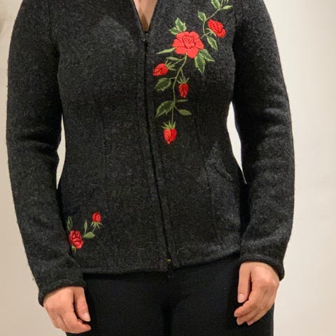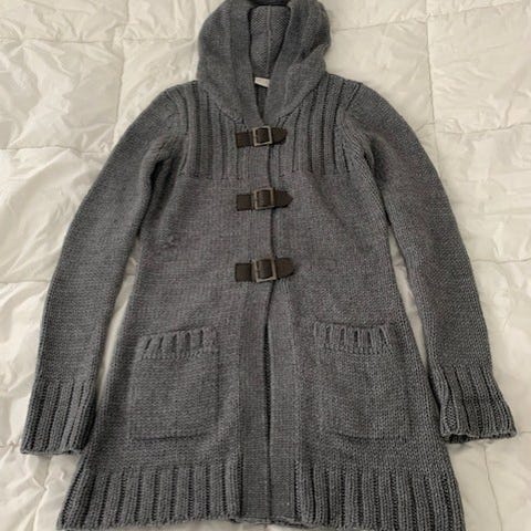 Espritin ihana lyhythihainen neule / neuletakki / kuvioneule / kuvioneuletakki, koko XS. Mitat kaula-helma n. 47 cm, niska-helma, n. 57 cm, kainalo-kainalo n. 43 cm. Paksua ja pehmeää neulosta, materiaali 76% akryylia, 12% villaa ja 12 % alpakkaa. Väri tummanharmaa-valkoinen. Kaunis kuvio neuleen yläreunassa sekä edessä että takana. Edessä kolme isoa avattavaa nappia. On ollut vähäisellä käytöllä, joten on todella siistissä kunnossa, melkein kuin uusi. Hinta 40€. Nouto Espoo / Helsinki (esim. Espoontori / Lippulaiva / Sello / rautatieasema / Kamppi). Voin myös postittaa, jolloin postituskulut lisätään hintaan. Tori-diili tai tavalliset kaupat.