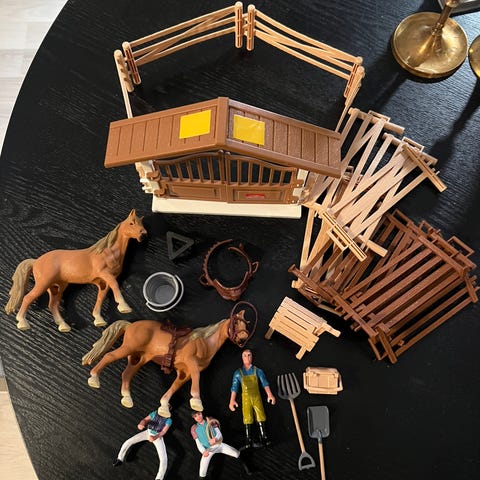 Hevosleikkeihin, aitaus, 2 hevosta ja kuvissa näkyvät tarvikkeet.
