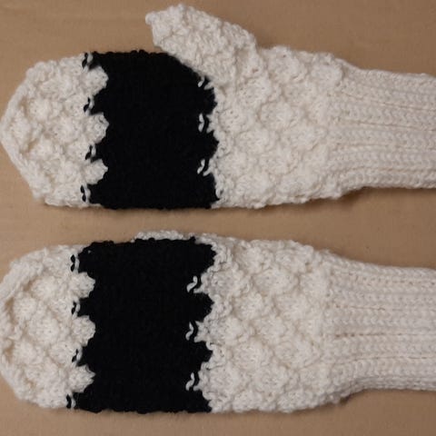 Vaaleanpunaisesta ja mustasta Seitsemän Veljestä -langasta neulotut lapaset naisten koossa. Uudet.