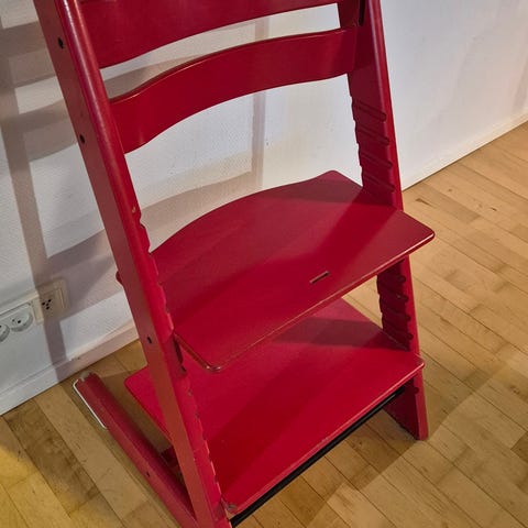 Stokke Tripp Trapp syöttötuoli valmistettu puusta, ruskea väri. Lasten syöttötuoli, jossa säädettävä istuin- ja jalkatuki. Tuolissa näkyvissä käytön jälkiä ja kulumaa.