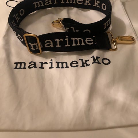 Musta Marimekko laukun hihna, kultaiset soljet. Marimekko teksti mustalla ja vain toisella puolella hihnaa, kunto muuten kuin uusi mutta solki hopean värinen. (KTS kuva)