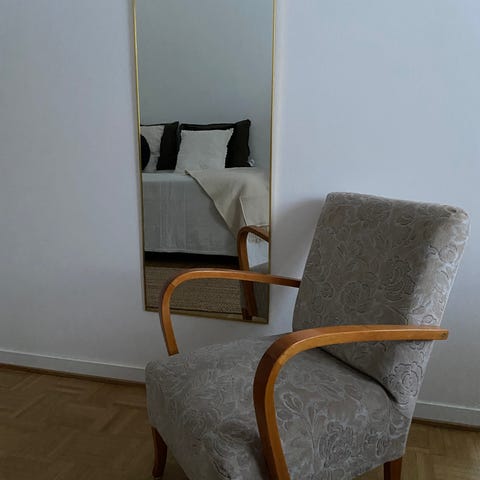 Nojatuoli vaaleaa kangasta (mokanoloinen mutta kangasta). Ostettu 2024 keväällä uutena. Selkänojassa vähän tummaa likaa (näkyy kuvassa 3) mutta siisti yleisilme. Mukava osrua ja kevyt siirrellä.