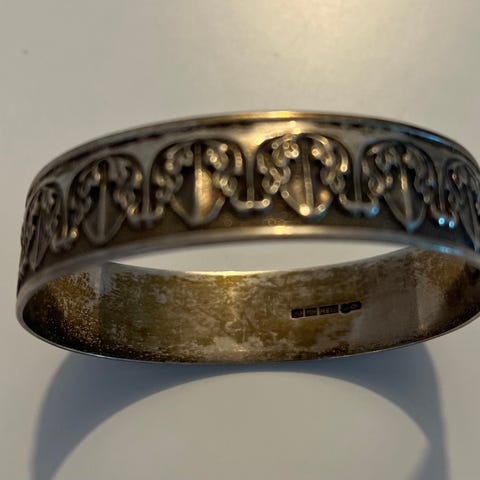 Vanha kotimainen hopeinen rannekoru. Kohokuvioitu. Sarana ja lukkolaite. Kello Oy Helsinki. Lukon kielessä leimat KM, vene (Helsinki), E7 eli vuodelta 1958. Sisähalkaisijat 5,5 ja 6,5 cm. Leveys 9 mm.