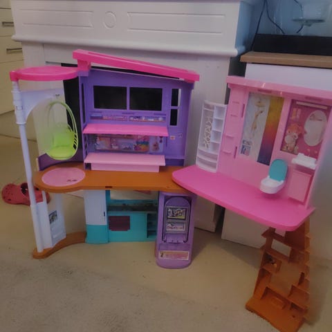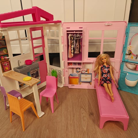 Barbie leikkitalo lasten lelu, sisältää vaaleanpunaisen ja sinisen värisiä osia, mukana nukke ja kalusteita. Sopii lasten leikkeihin ja mielikuvitusleikkeihin.