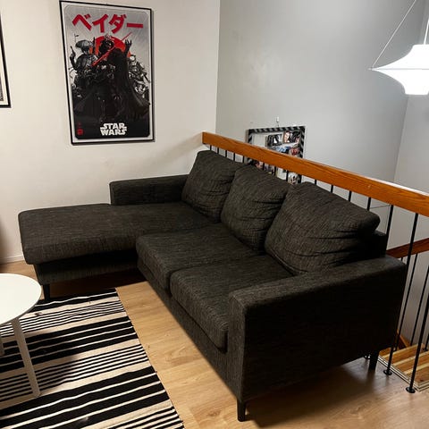 Sohva nyt meidän väliaikaiskodissa Loukonlahdessa.