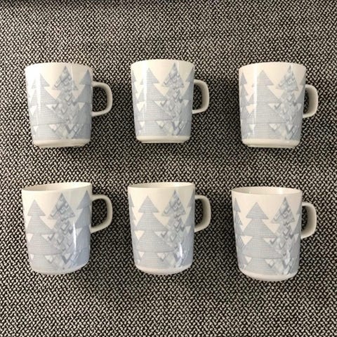 Neljä Marimekon Kuusikossa-sarjan pientä mukia (2 dl) sekä servettipaketti kaupan päälle.