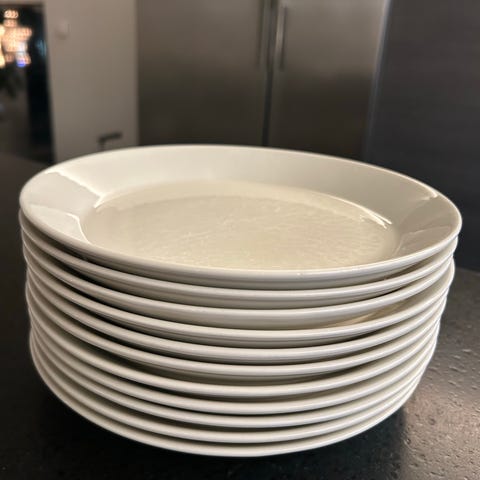 Iittalan Teema leipälautasia 8kpl valkoisella värillä. Naarmuja on tullut ajansaatossa, mutta lasitus täysin ehjä.