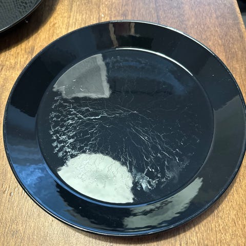 Käytönjälkiä on esim naarmuja ja leimojen haalistumista, mutta lasitus on ehjä.