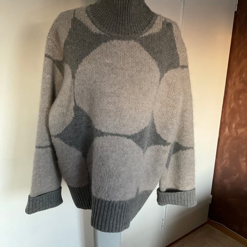 Myydään vain kerran käytetty Marimekon harmaa 'Koralli Kivet' villapaita. Lämmin, pehmyt neule, poolokaulus ja napit toisella olkapäällä.
