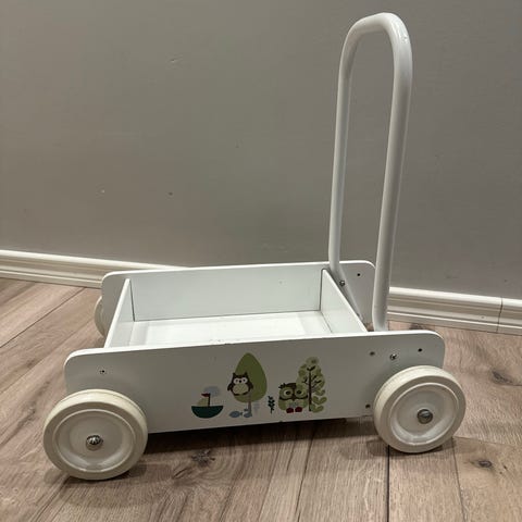Kärry on vakaa ja sen saa lukittua paikalleen, jolloin nappulat saa asettaa ylös. Puhuu ranskaa ja hollantia, on soivia näppäimiä ja muita ominaisuuksia. Valot vilkkuvat ja kärry laulaa jos sitä työntää. Äänet saa myös pois. On toiminut hyvänä apuna kävelyn opetteluun, kun ei keikkaa.