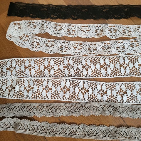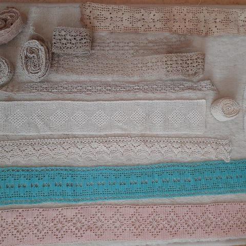 Käsinvirkattua käyttämätöntä, vanhaa pitsiä 1900-luvun puolivälistä. Toinen rulla 280 cm pitkä ja toinen 340 cm. Hp. 20 euroa yhteensä. Voin lähettää.